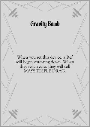 To create a Device, take two or more Components to the Refs and explain what you are making. This can usually only be done in an interactive, and will very rarely be available on linears. They will offer you a potential result - you can take this result, or keep the resources but suffer a minor experimental setback (generally accompanied by a minor roleplaying effect, with a small chance of a wound). Sometimes the result may be “that can’t be done with a Device” but in that case you will get the resources back with no issues.