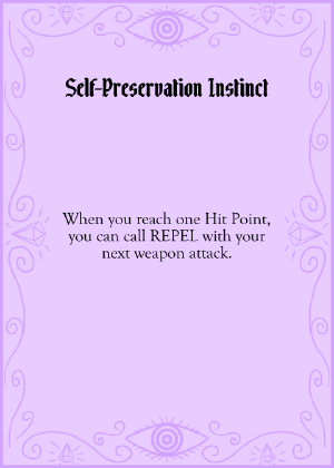 Self-Preservation Instinct | 3 | When you reach one Hit Point, you can call REPEL with your next weapon attack. |